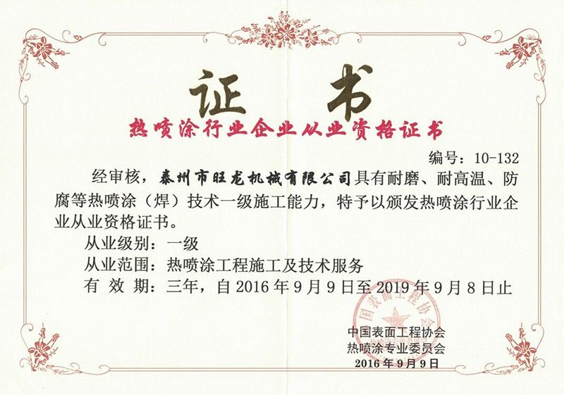 上一證書:熱噴涂行業從業證書